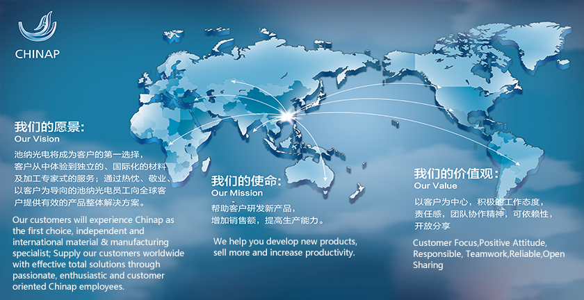 我們的愿景:池納光電將成為客戶的第一選擇 , 客戶從中體驗到獨立的 , 國際化的材料及加工專家式的服務;通過熱忱,敬業,以客戶為導向的池納光電員工向全球客戶提供有效的產品整體解決方案。